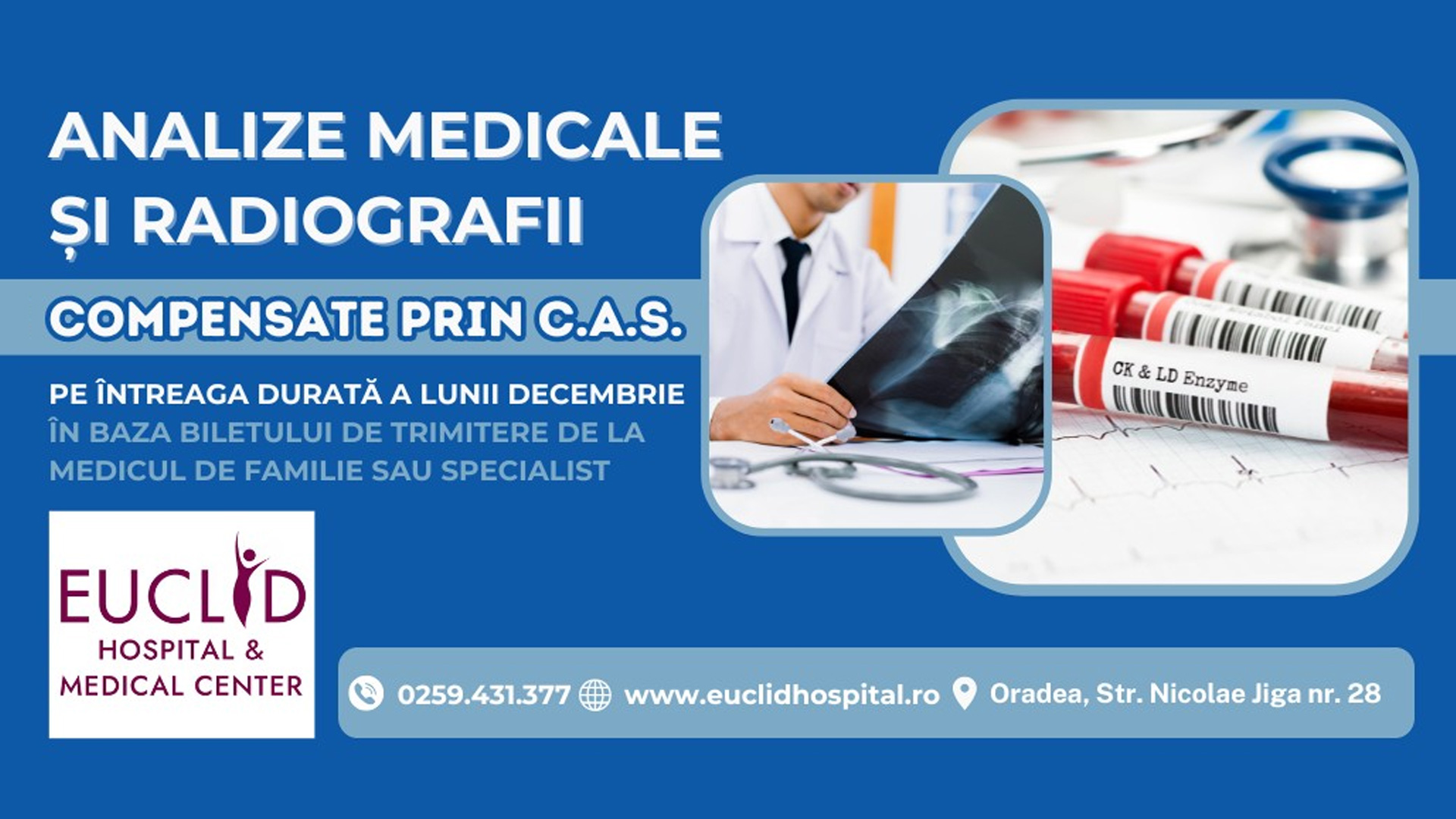 Pe toată durata lunii DECEMBRIE, Laboratorul de Analize din cadrul Euclid Hospital & Medical Center, dispune de fonduri pentru analize compensate de către Casa de Asigurări de Sănătate Bihor.