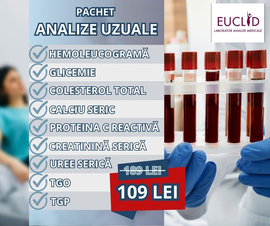 Pachetul de analize uzuale, pentru monotorizarea principalelor organe și funcții ale corpului, care include: hemoleucgrama completă, glicemie, colesterol total, calciu seric, proteina c reactivă, creatinina serică, uree serică, TGO, TGP la un preț special de 109 lei, redus de la 189 lei.